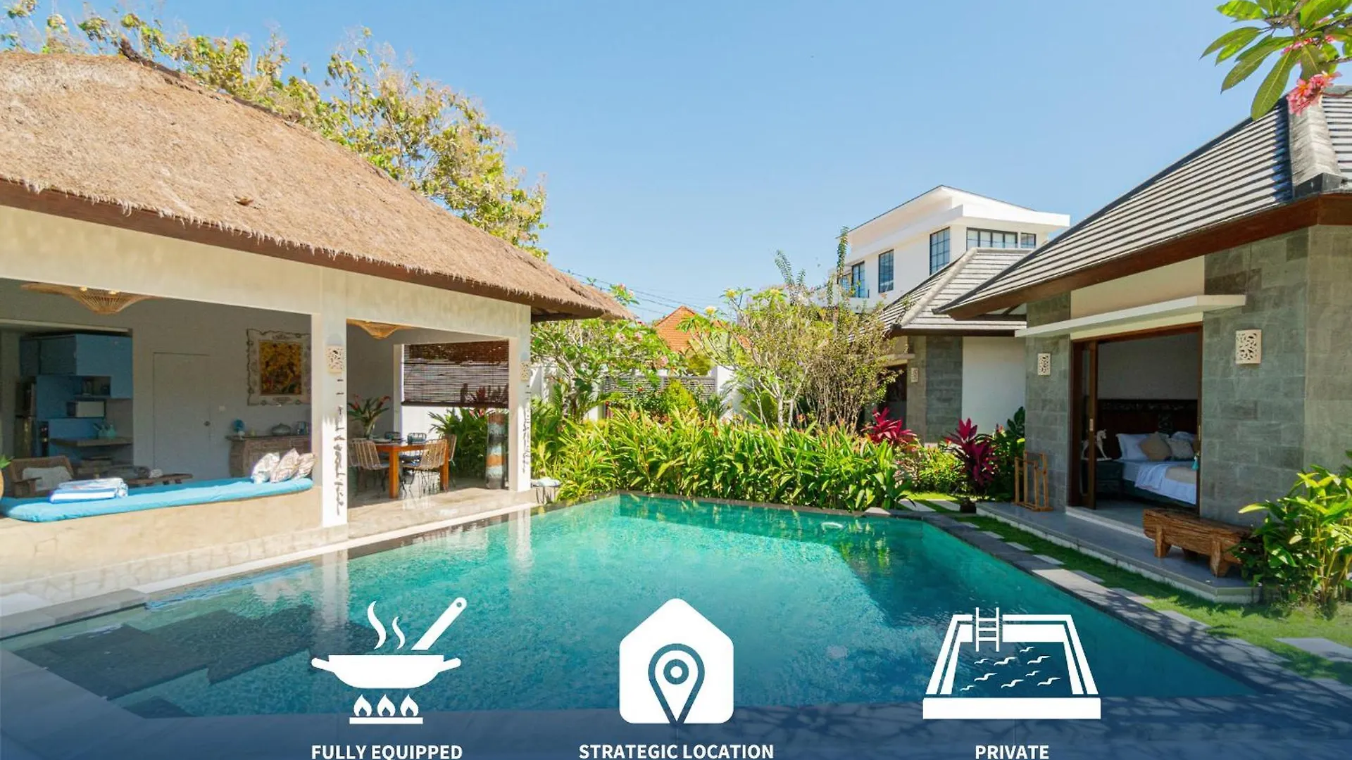 客人还可使用冰箱 和炉子。 从别墅到伍拉-赖国际机场开车仅需20分钟。 客人一定会喜欢私人游泳池。